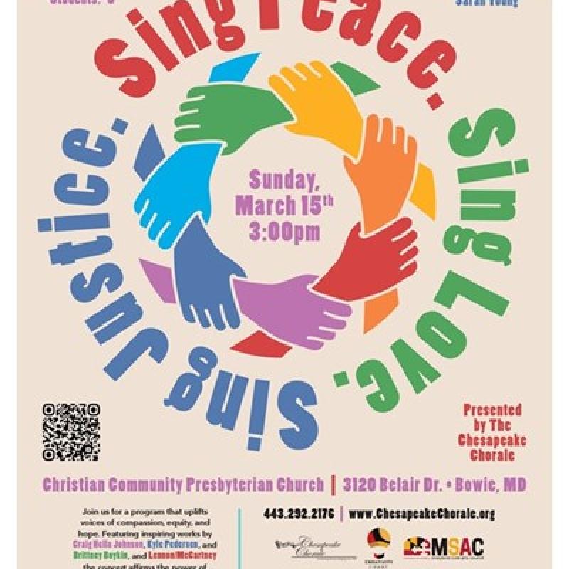 The Chesapeake Chorale, under the direction of Dr. Iain Sturrock, presents “Sing Peace, Sing Love, Sing Justice” on Sunday, March 15th, 3PM, at the Christian Community Presbyterian Church (3120 Belair Dr. Bowie, MD).