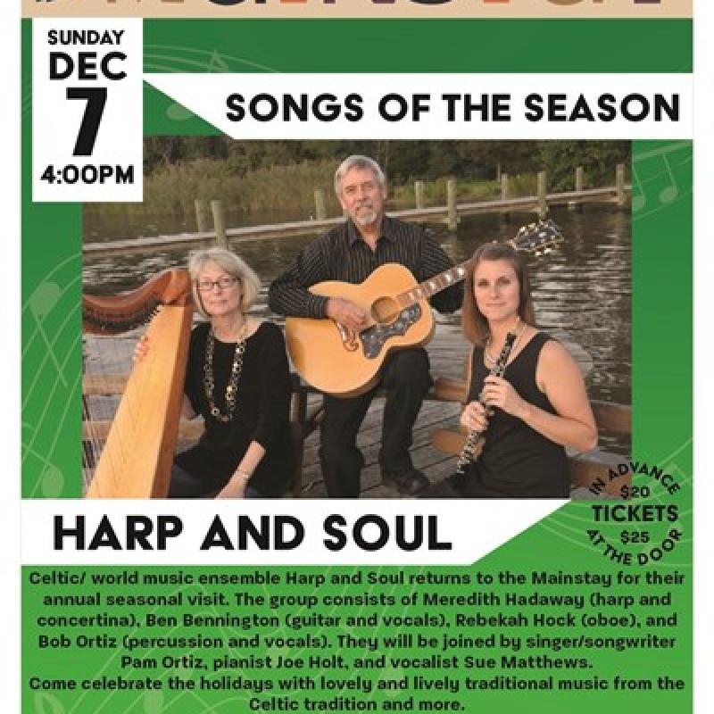 Celtic/ world music ensemble Harp and Soul returns to the Mainstay for their annual seasonal visit. The group consists of Meredith Hadaway, Ben Bennington, Rebekah Hock, and Bob Ortiz.