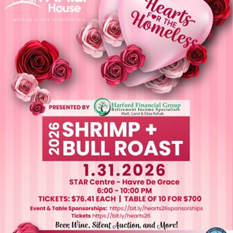 Enjoy an evening of food, fun, and fellowship at Harford Family House’s Hearts for the Homeless Shrimp & Bull Roast! Buffet by Atlantic Caterers, auctions, raffles, DJ, and dancing—all to help families experiencing homelessness in Harford County.