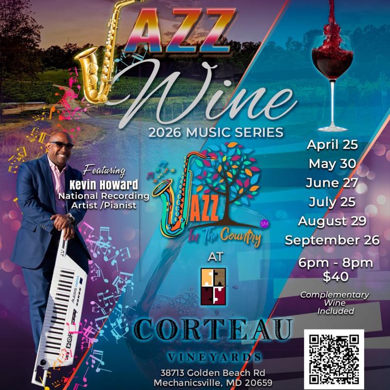 Jazz In The Country expands into St. Mary’s County with our brand-new monthly Jazz & Wine Series at Corteau Vineyards! Expect bold jazz, standout regional artists & award-winning wines. Admission includes a complimentary glass of wine or sangria.