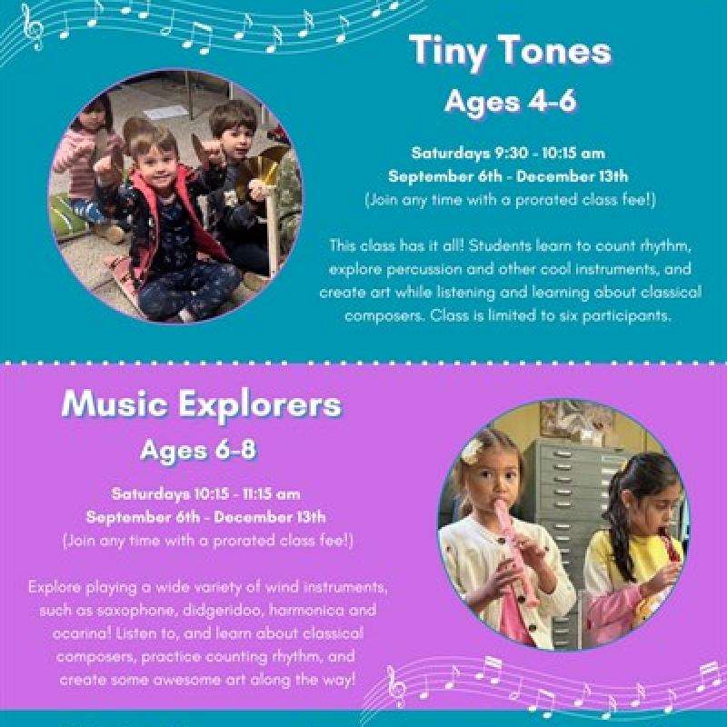 We are grateful to offer music classes for all ages, starting September 6th through December 13th! We have Tiny Tones (ages 4-6) and Music Explorers (ages 6-8). Learn more about these classes, as well as others, and sign up, on our website!